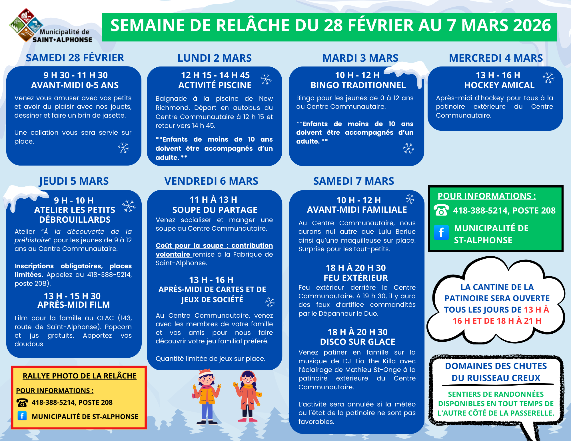 Vous trouverez ci-jointe la programmation pour la semaine de relâche qui aura lieu du 28 février au 7 mars 2026.